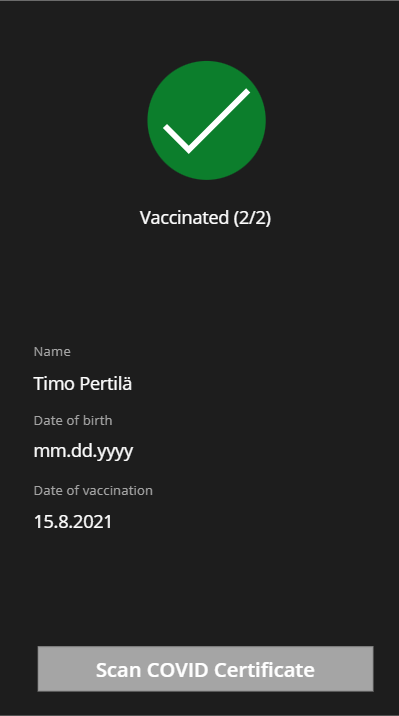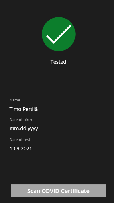 Paluuarvojen perusteella Power Apps kertoo, onko luettu koronatodistus kelvollinen (rokotuksista kulunut tarpeeksi aikaa, testi riittävän tuore jne). Näytöllä voitaisiin esittää myös muuta tarpeellista tietoa, joka auttaa varmistamaan siitä että todistus kuulu esittäjälleen.