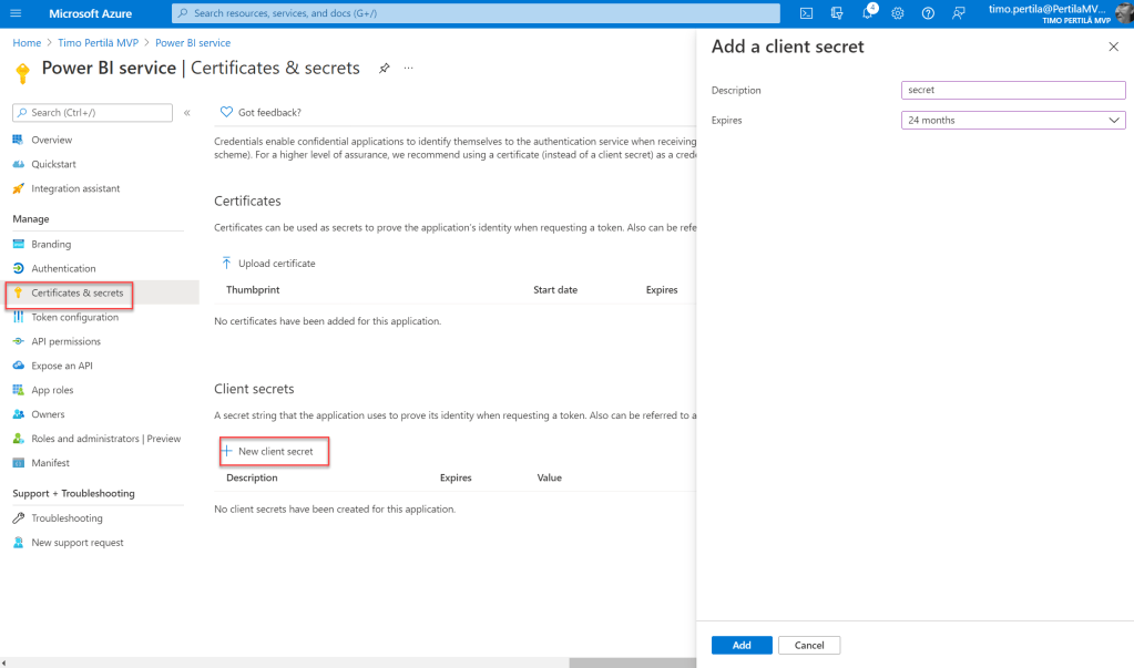 Power BI:n REST API:a voi käyttää käyttäjällä (user) tai sovelluksella (Service Principal). Käytetään jälkimmäistä vaihtoehtoa.