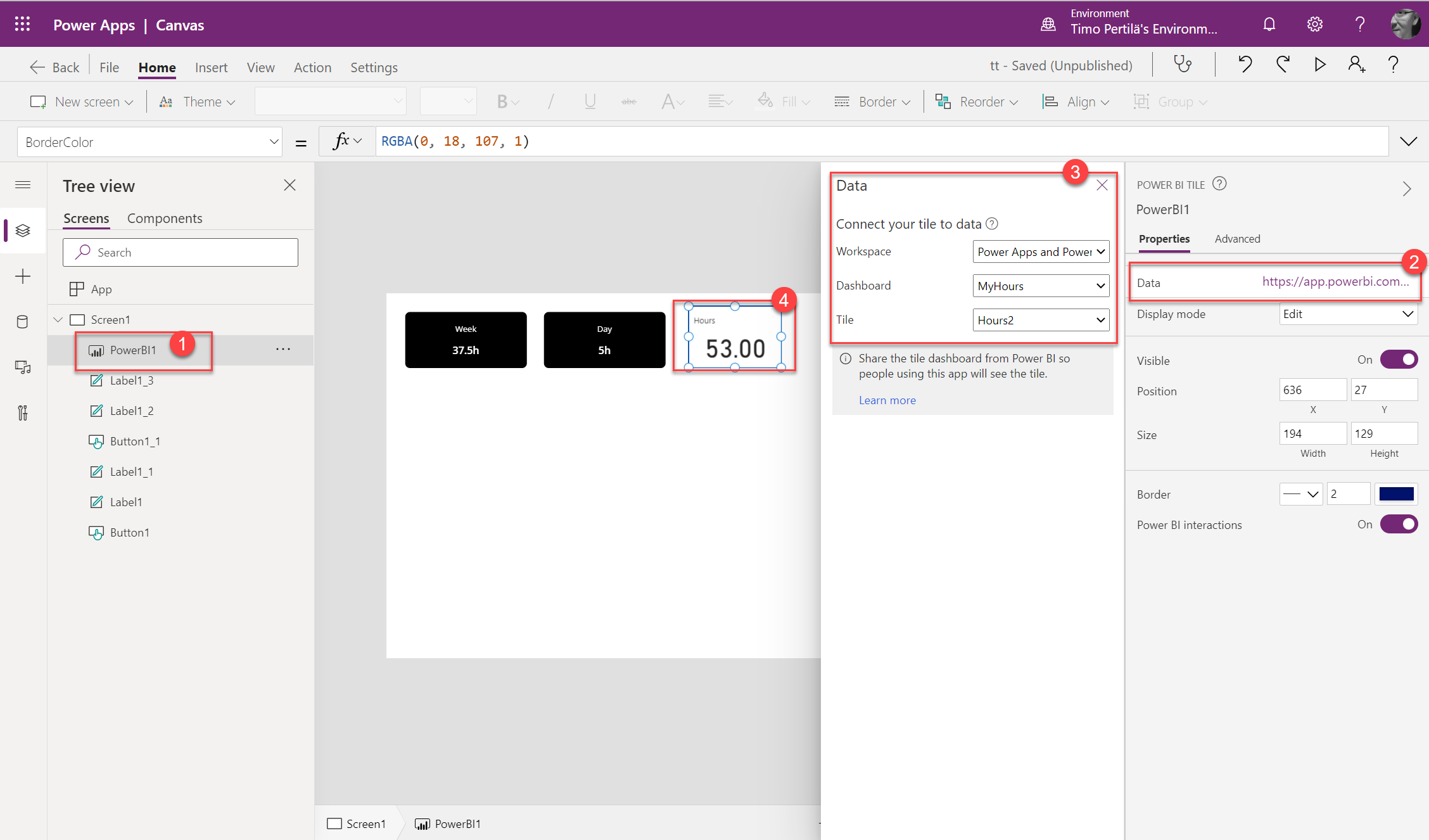 Lopuksi lisätään Power Appsiin Power BI tile -kontrolli (1) ja määritelläään sen tietolähteeksi (Data, 2) luomamme tiili (3). Lopputuloksena tiilen sisältö ilmestyy sovellukseen.
