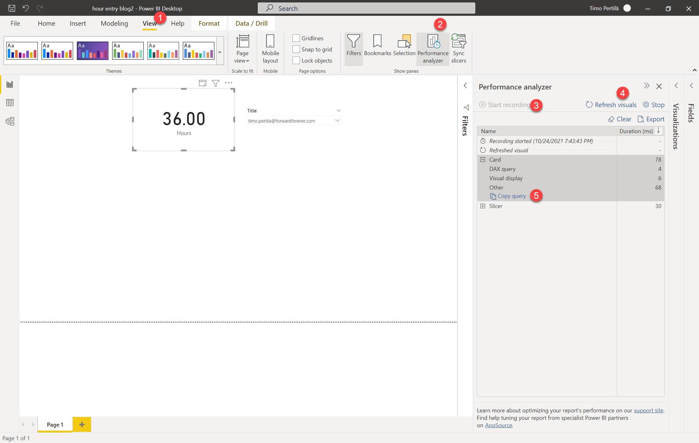 - Avataan raportti Power BI desktopilla, tehdään halutut suodatukset ja siirrytään View-välilehdelle (1)