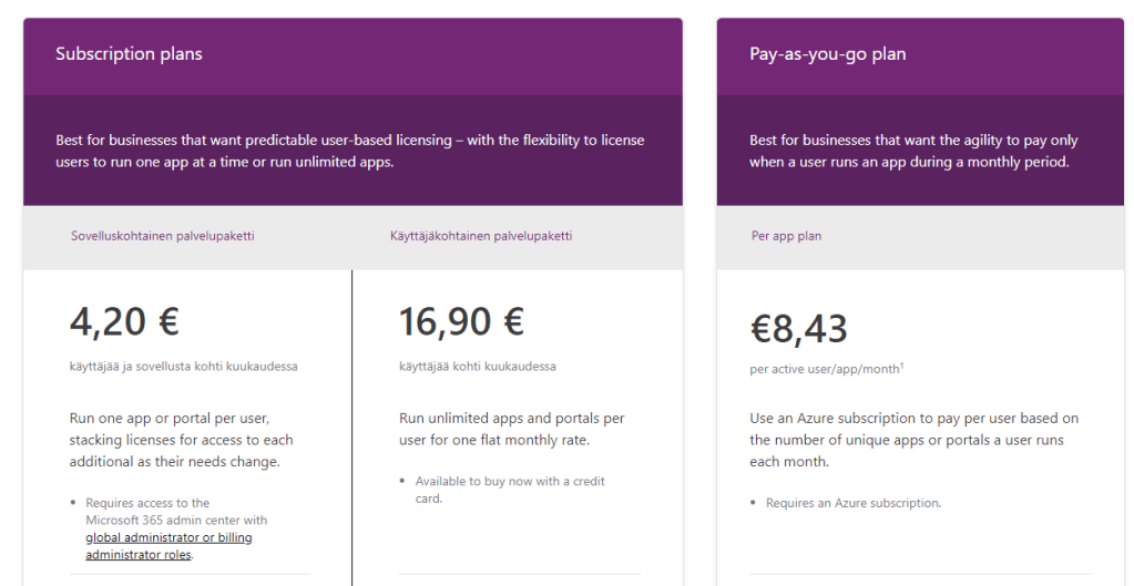 Veloitus kohdistuu Azuren tilaukseen (subscription). Eri Power Appsien käyttökustannukset voi siis suoraan kohdistaa oikeisiin paikkoihin.