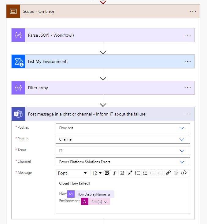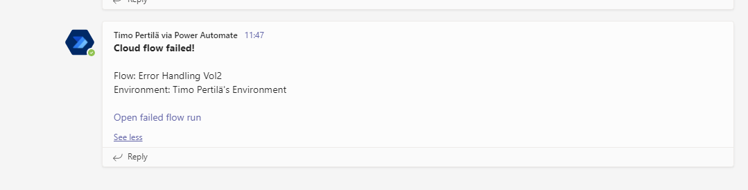 Mikä parasta, voit kopioida koko virheenkäsittelyn (Scope – On Error) sellaisenaan toiseen flow’hun.