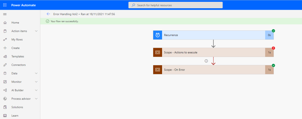 Suorituksesta näemme, ettei flow pääty virhetilaan. Koska ohitamme virheen ja jatkamme matkaa On Error -osioon.