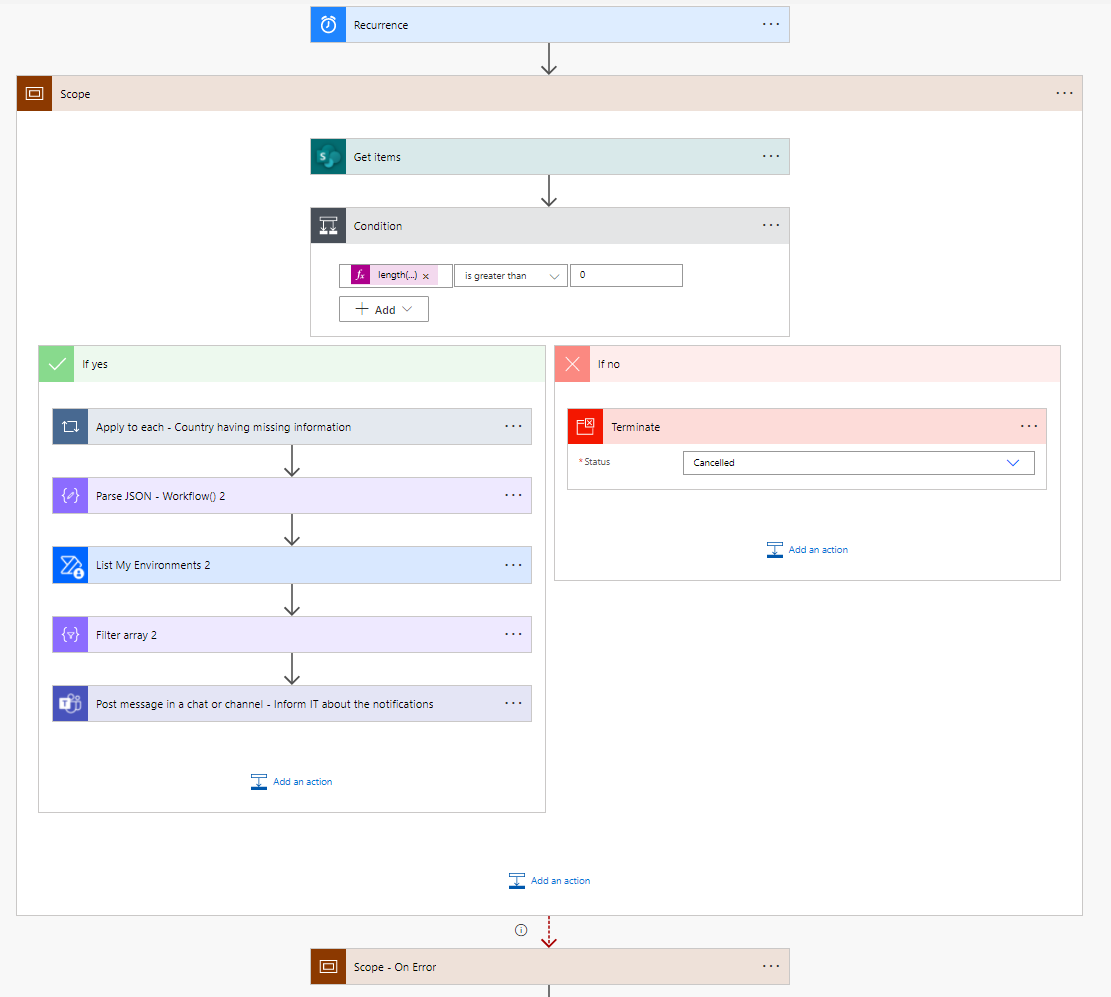 - Mikäli työnkulussa joku vaihe menee virheeseen, lähetetään myös siitä tieto IT:lle (Scope – On Error)