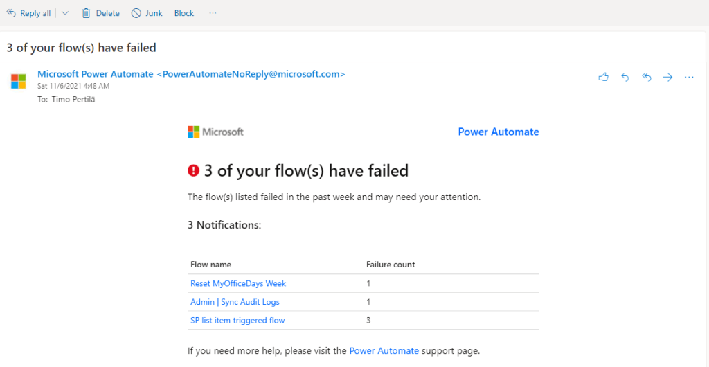 Mikäli flow’ssa tapahtuu virhe, tulee IT:n Teamsiin seuraava viesti.