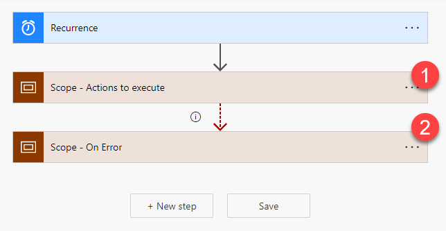 Idea on yksinkertainen. Suoritettavat toiminnot ovat yhden scope-toiminnon (1) sisällä. Sen perässä on toinen scope-toiminto (2), joka sisältää virhetilanteessa suoritettavat toiminnot.