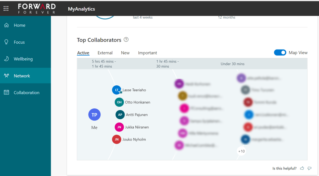 Keille kaikille palautepyyntö henkilöstä x lähetetään? Viva Insights kertoo, keiden kanssa työskentelen aktiivisesti (perusten sähköposteihin, kalenteritapaamisiin, teams-kommunikaatioon jne).