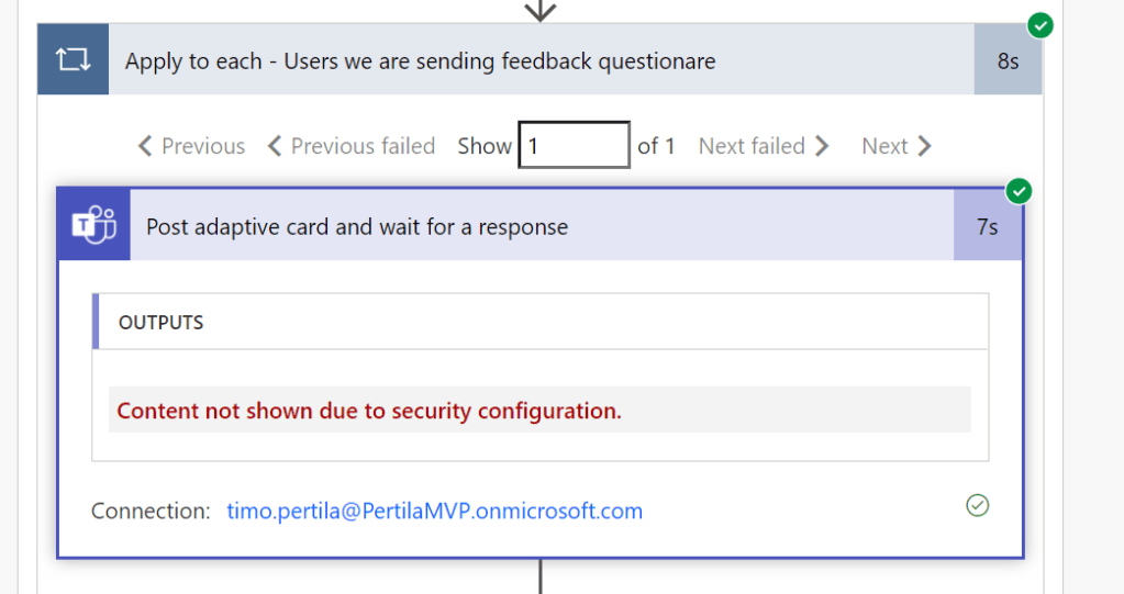 Flow jää odottamaan käyttäjän vastausta mukautettavaan korttiin. Tämän takia molempien Apply to each -silmukoiden asetuksista tulee laittaa rinnakkaisuus päälle (Concurrency Control).