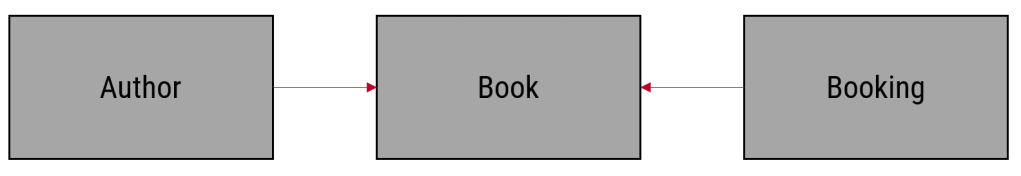 Tietomallimme on yksinkertainen. Meillä on kirjoja (book), joihin liittyy kirjoittaja (author) sekä 0-n kappaletta lainauksia (booking).