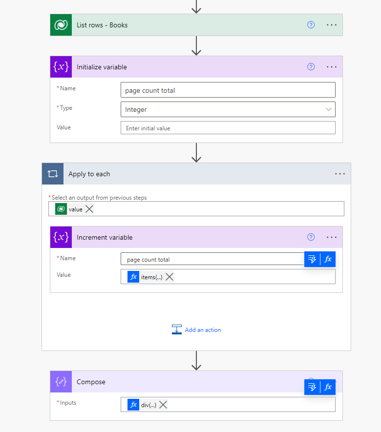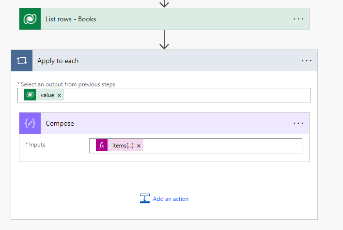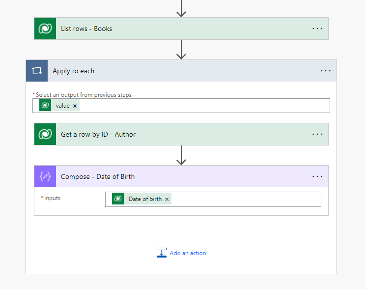 Ongelma on tietenkin se, että suoritamme jokaisen kirjan kohdalla ylimääräisen Power Platform palvelupyynnön (Get a row by ID – Author).