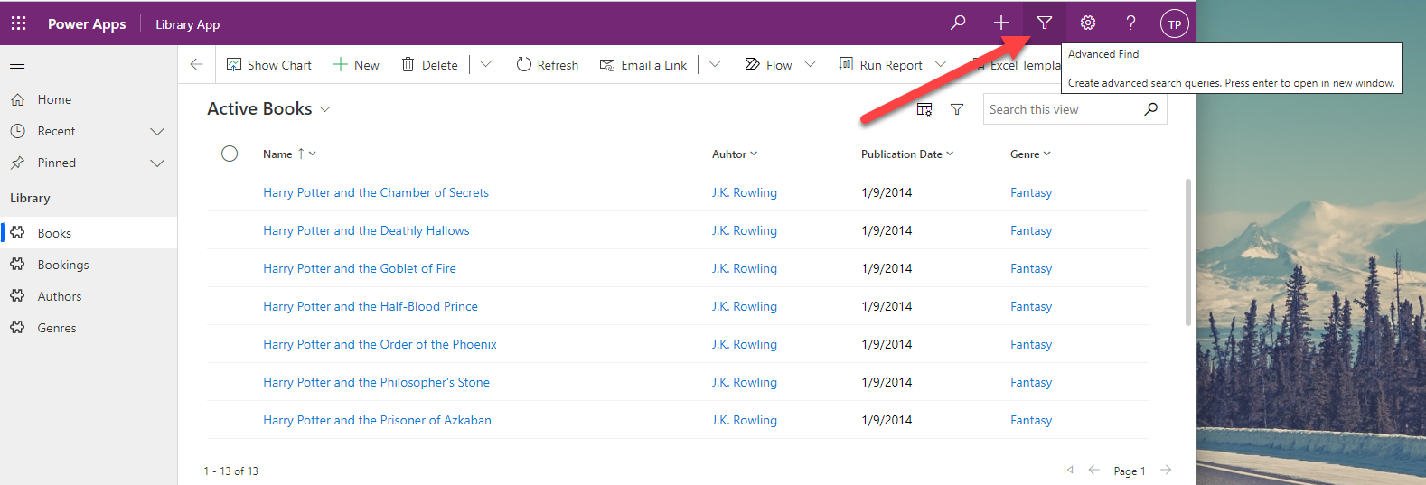 Avataan mallipohjainen sovellus, jolla kirjoja ja niiden varauksia tarkastellaan. Oikeasta yläreunasta löytyy Advanced Find -toiminto.