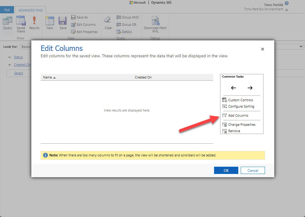 Lisätään hakutulokseen halutut kentät (Edit Columns).