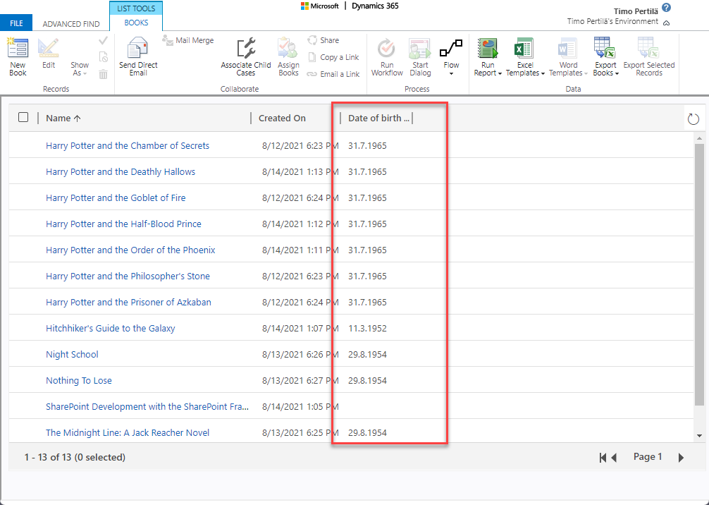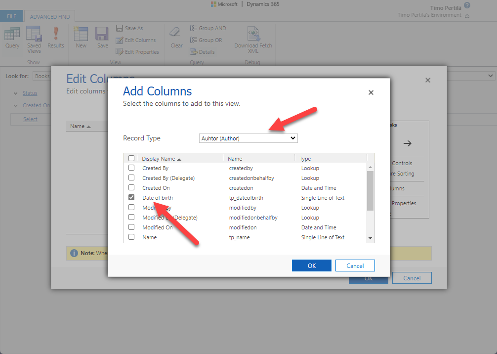 Vaihdetaan tauluksi (Record Type) Author ja poimitaan mukaan Date of Birth -kenttä.