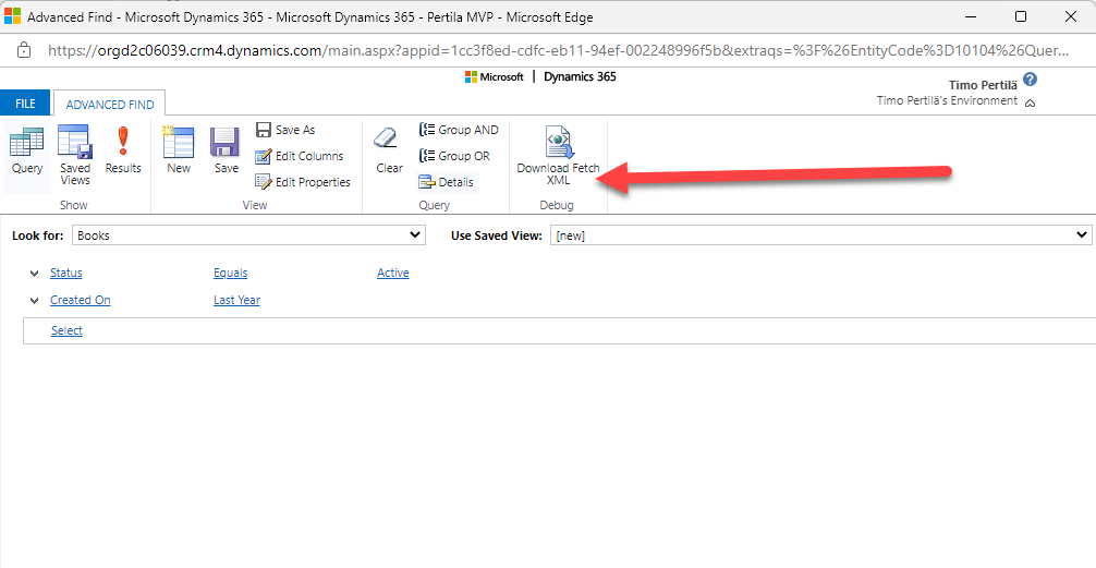 Varsinainen taika piilee kuitenkin hakueditorin viimeisessä ikonissa. Voit ladata luomasi kyselyn Fetch XML -muodossa!