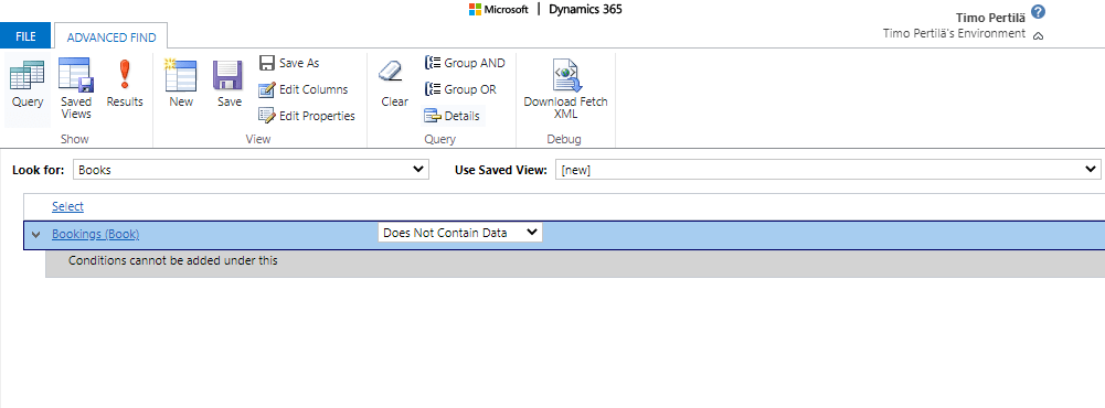 Luodaan Advanced Find:lla kysely, joka palauttaa kaikki kirjat joihin ei liity Bookings-riviä.
