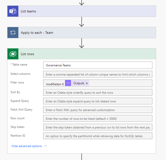 - Haetaan Dataversen Teams-taulusta tiimit, joiden TeamGUID-sarakkeen arvo vastaa vuorossa olevan tiimin tunnistetta