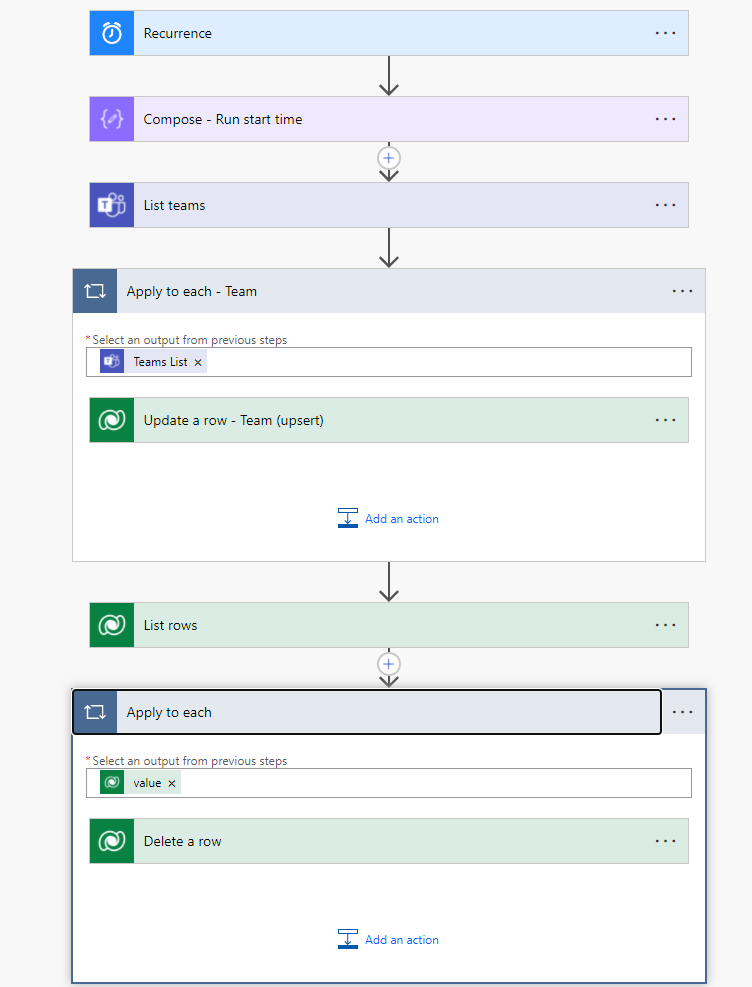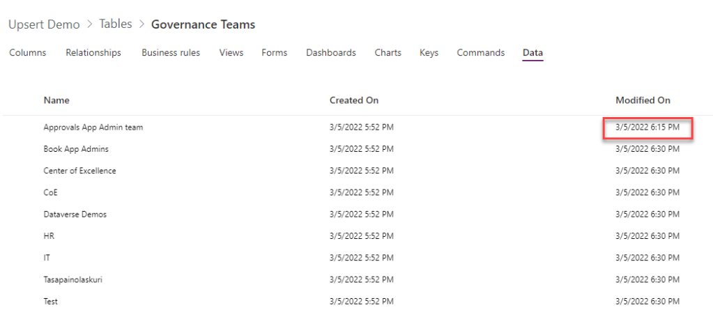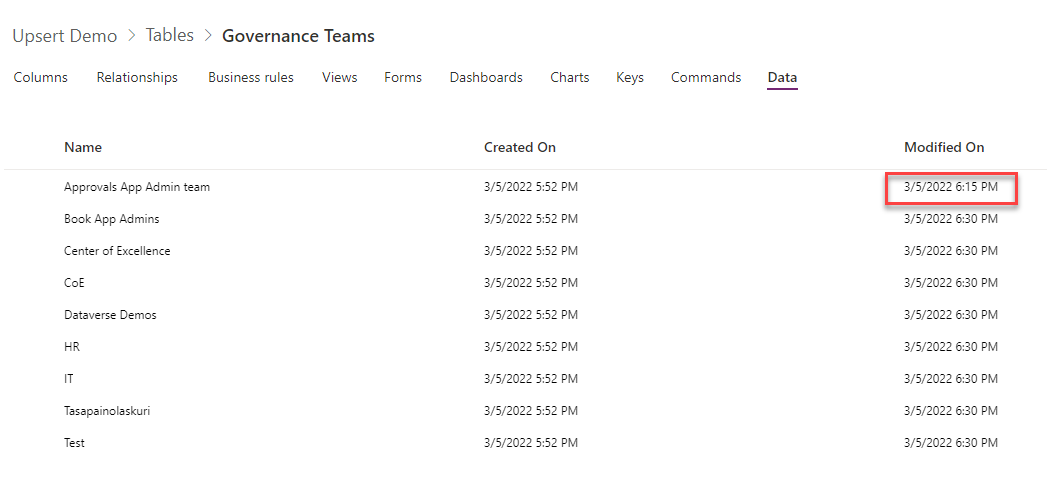 Upsert (ja update) päivittää riviä aina. Poistetut tiimit erottuvatkin listalta Modified On -kentän perusteella. Flow ei ole päivitänyt niitä.