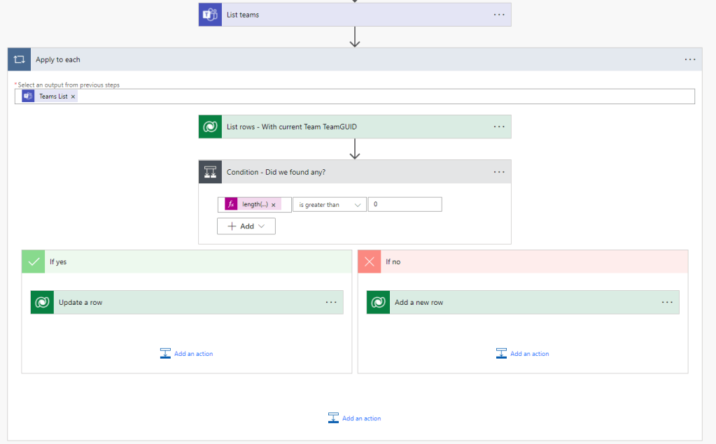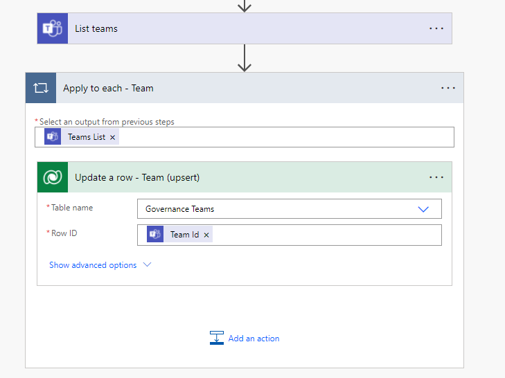 Valmis! Emme tarvitse mitään muuta. Mikäli tiimin tunnisteella löytyy rivi Dataversestä, se päivitetään. Muussa tapauksessa luodaan uusi rivi. Uusi rivi Dataversessä saa tunnisteekseen vastaavan tiimin tunnisteen.