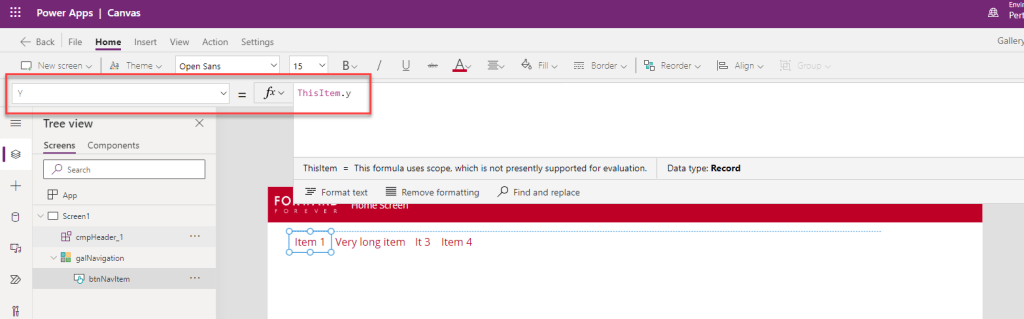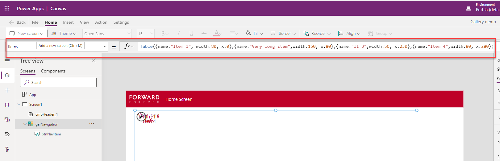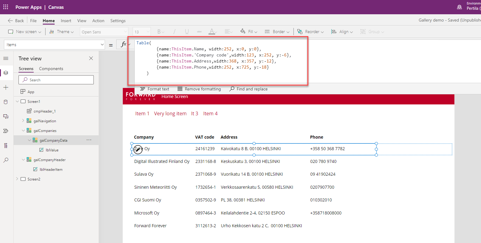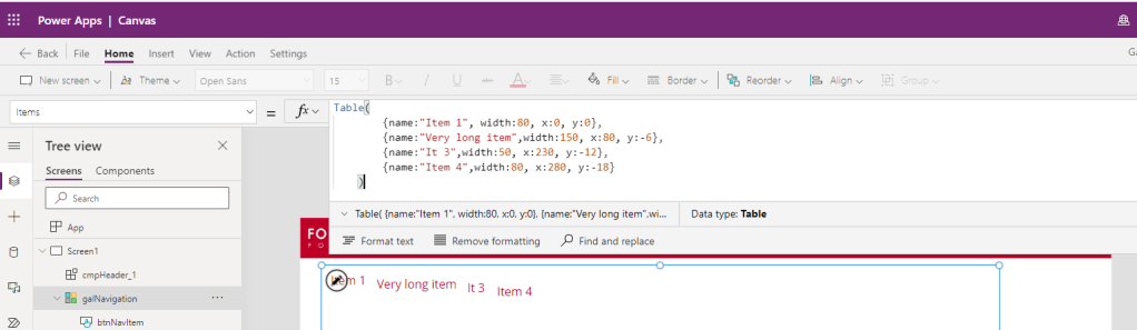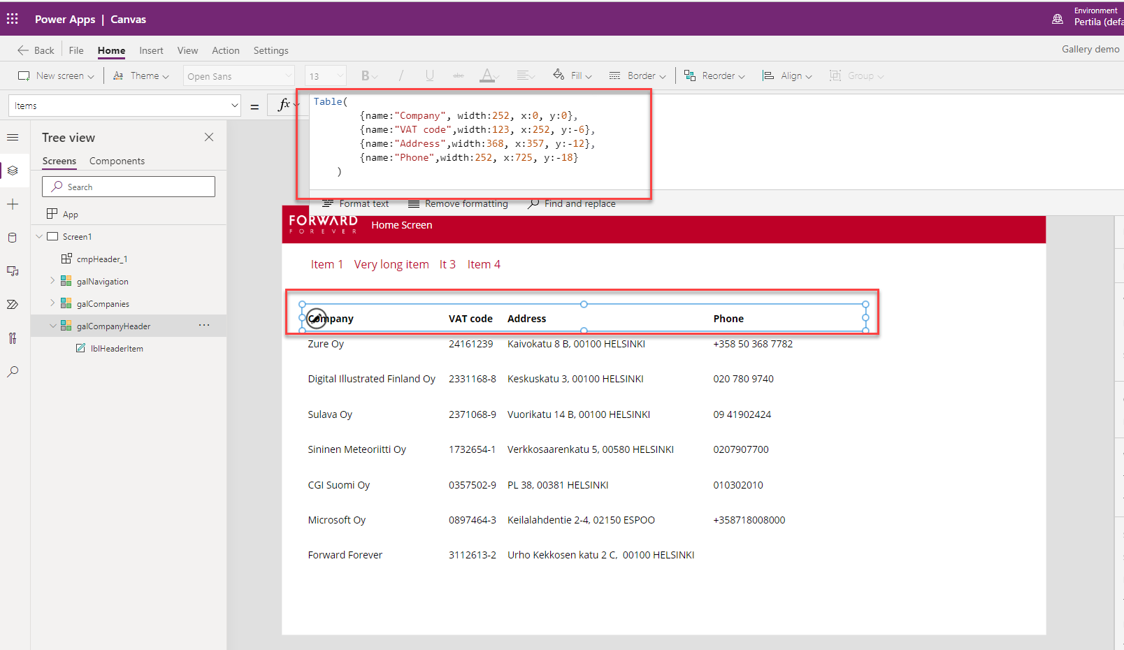 Muuuten hyvä, mutta Power Apps haluaa asetella elementit vaakasuunnassa limittäin (elementit laskevat oudosti). Lisätään taulukkoon elementille myös y-arvo, jota hieman manipuloimme.