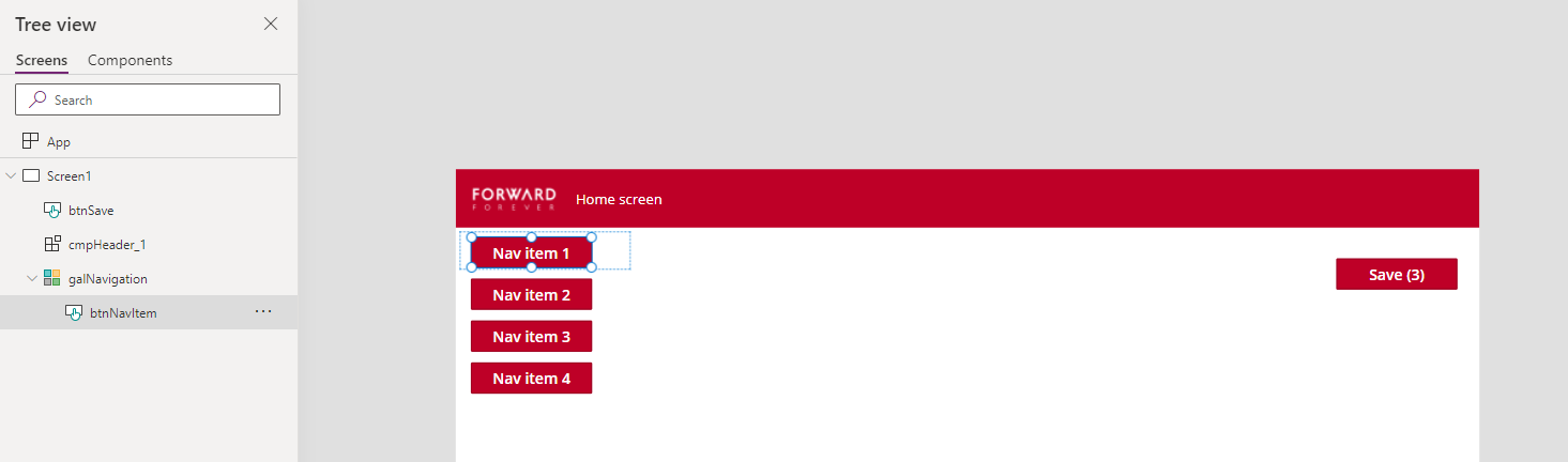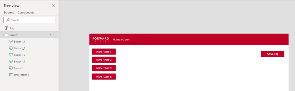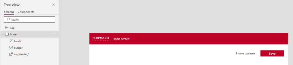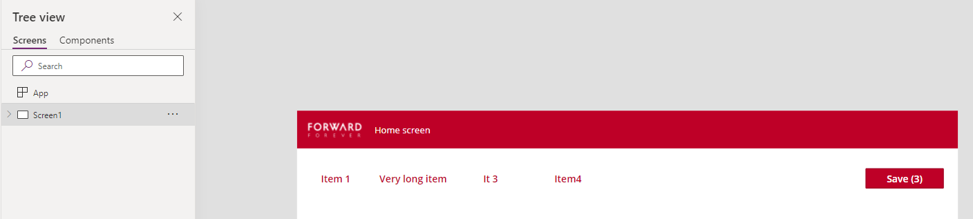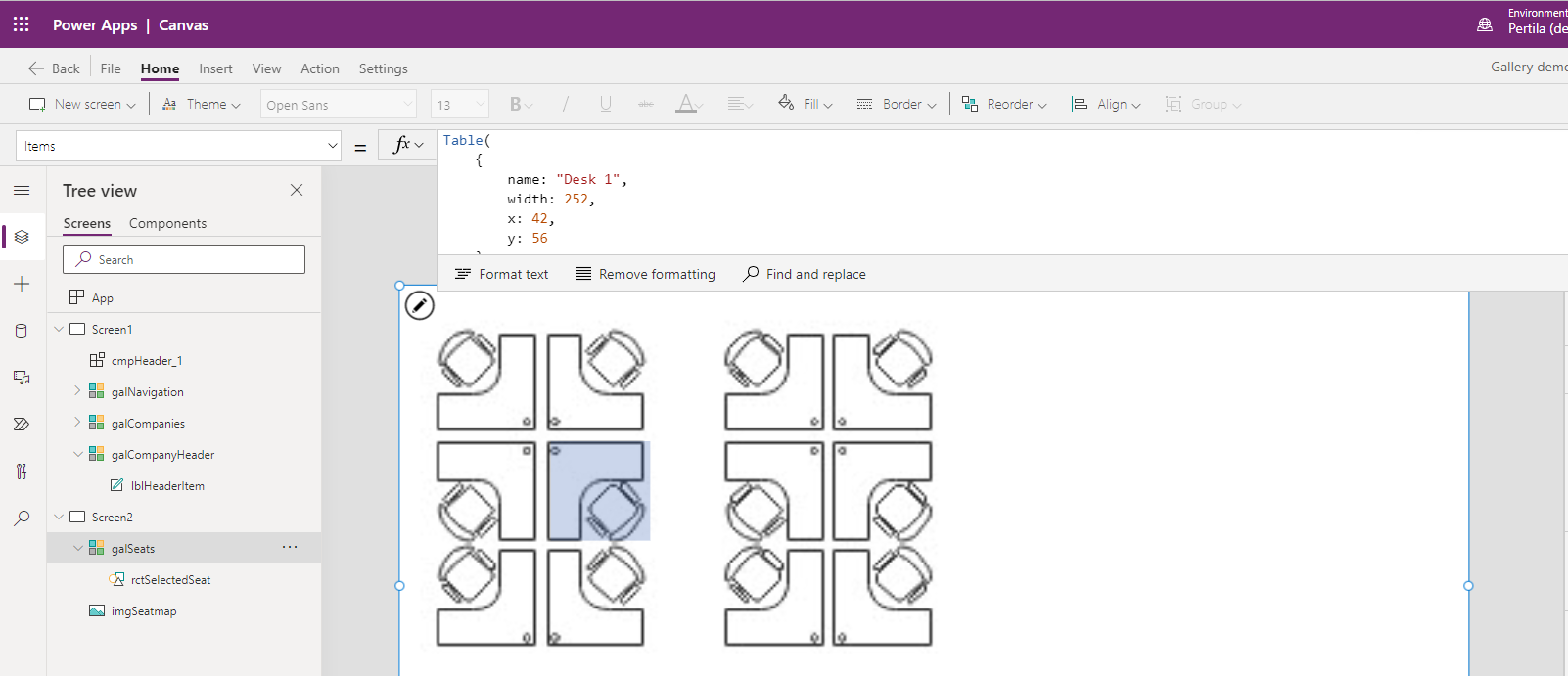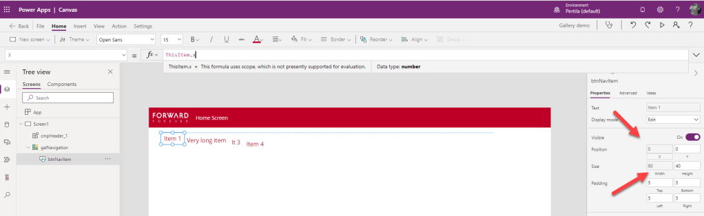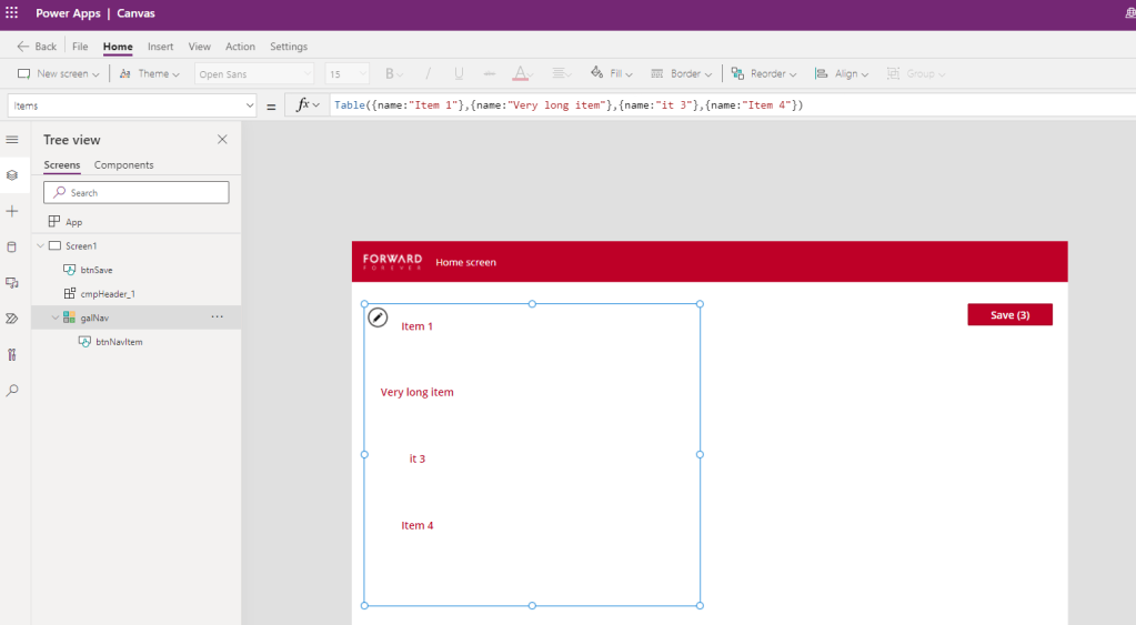 Muuuten hyvä, mutta Power Apps haluaa asetella elementit vaakasuunnassa limittäin (elementit laskevat oudosti). Lisätään taulukkoon elementille myös y-arvo, jota hieman manipuloimme.