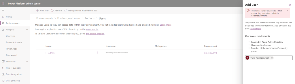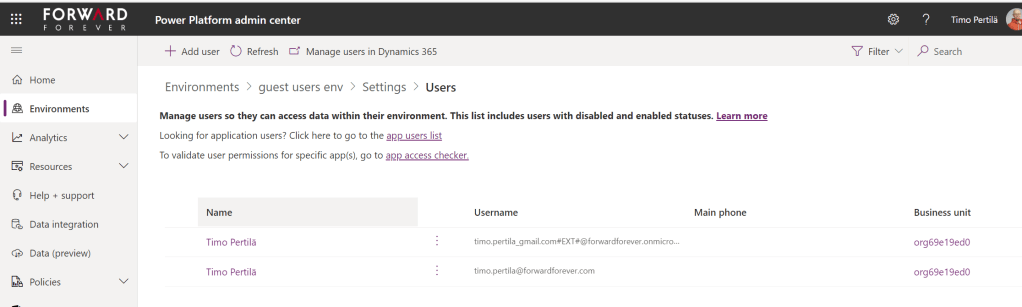 Mutta mitä loppujen lopuksi tapahtuu vieraskäyttäjä hyväksyessä kutsun? Power Platformin näkökulmasta ei yhtään mitään. Käyttäjä ei ilmesty Dataverseen käyttäjäksi. Pelkkä kutsun hyväksyminen ei siis muuta tilannettamme.