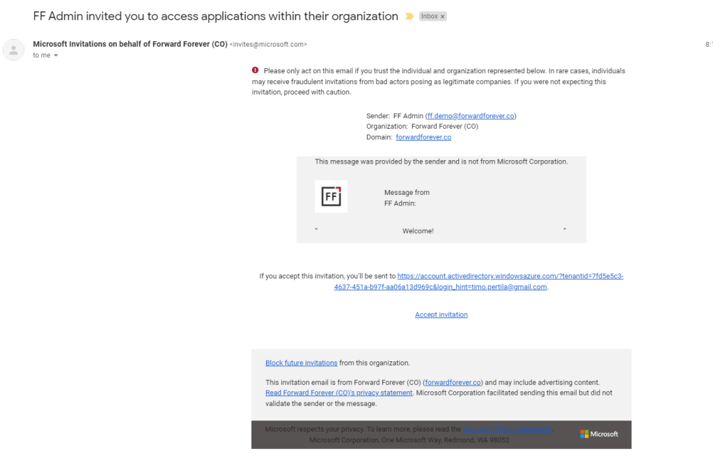 Kunhan vieraskäyttäjä on hyväksynyt kutsun ja hoitanut MFA-velvollisuudet kuntoon, voi hän avata sovelluksen (kunhan hänelle on lähetetty sen osoite).
