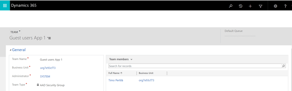 Käyttäjä ei kuitenkaan ilmesty AAD-ryhmään pohjautuvaan tiimiimme (joka syntyi automaattisesti kun jaoimme sovelluksen AAD-ryhmälle). Käyttäjä lisätään tiimiin vasta käyttäjän avatessa sovelluksen kyseisestä ympäristöstä.