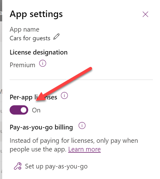 Huoma ettei tämä onnistu, mikäli ympäristölle ole annettu ei ole Power Apps per app -lisenssejä.