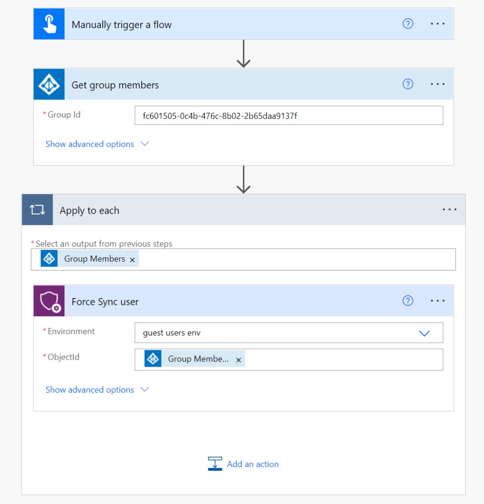 Käyttäjien lisääminen käsin vaikuttaa hieman tympeältä. Onneksemme voimme tehdä flow’n, jolla päivitämme Guest users App 1 -ryhmän käyttäjät Dataverseen.