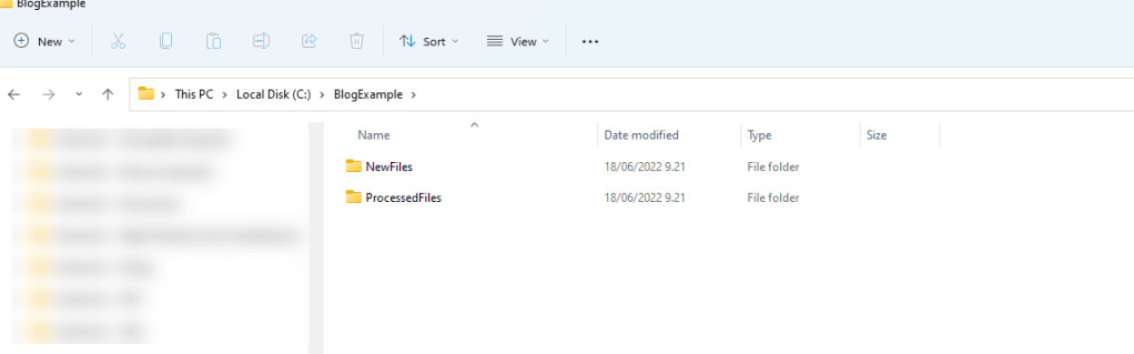 Koneellamme on kansio (BlogExample), jossa on omat alikansiot uusille (NewFiles) ja käsitellyille (ProcessedFiles) tiedostoille.
