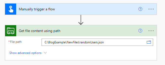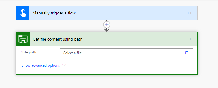 Luodaan painikkeella käynnistyvä flow ja lisätään toiminnoksi paikallisen tiedoston sisällön hakeminen (File system -> Get file content using path).