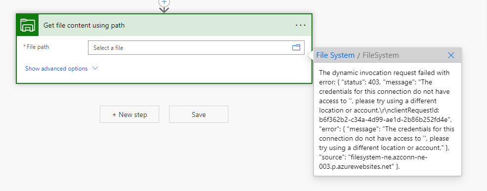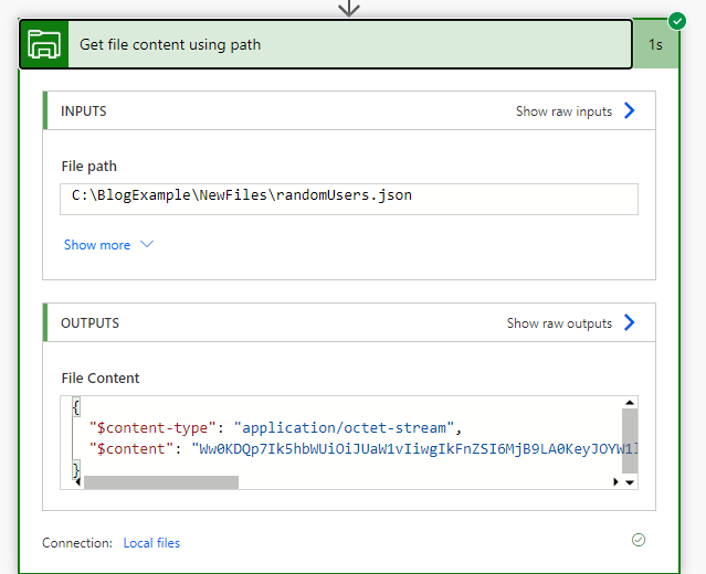 Asetetaan toimintoon (Get file content by using path) polku kyseiseen tiedostoon ja kokeillaan.