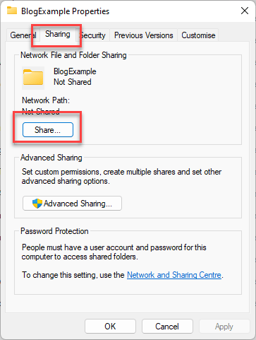 - Root folder – C:\BlogExample (voit käyttää myös levyjaon nimeä tyyliin \\TIMONKONE\MyShare)
