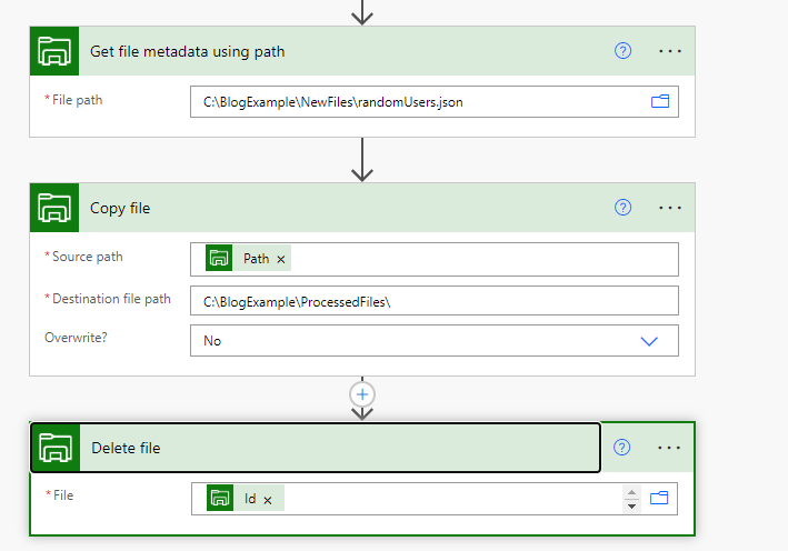 Lopuksi siirrämme käsitellyn tiedoston NewFiles-kansiosta ProcessedFiles-kansioon. Siirto (move) -toimintoa ei löydy, joten joudumme kopioimaan tiedoston (Copy file) ja poistamaan alkuperäisen (Delete file).