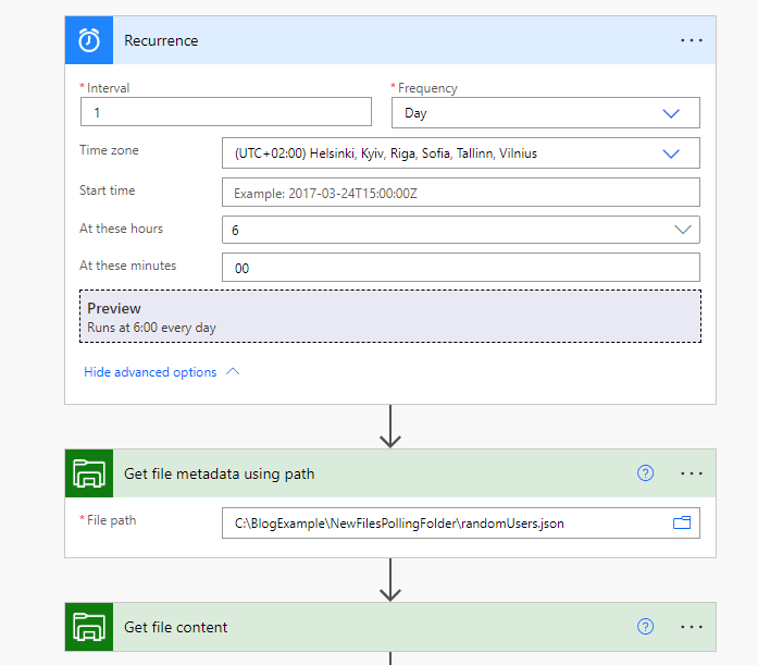 Mikäli kansioomme (NewFilesPollingFolder) ilmestyy säännöllisesti (esim. kerran vuorokaudessa) samanniminen tiedosto, voimme muuttaa flow’n alkua hieman.