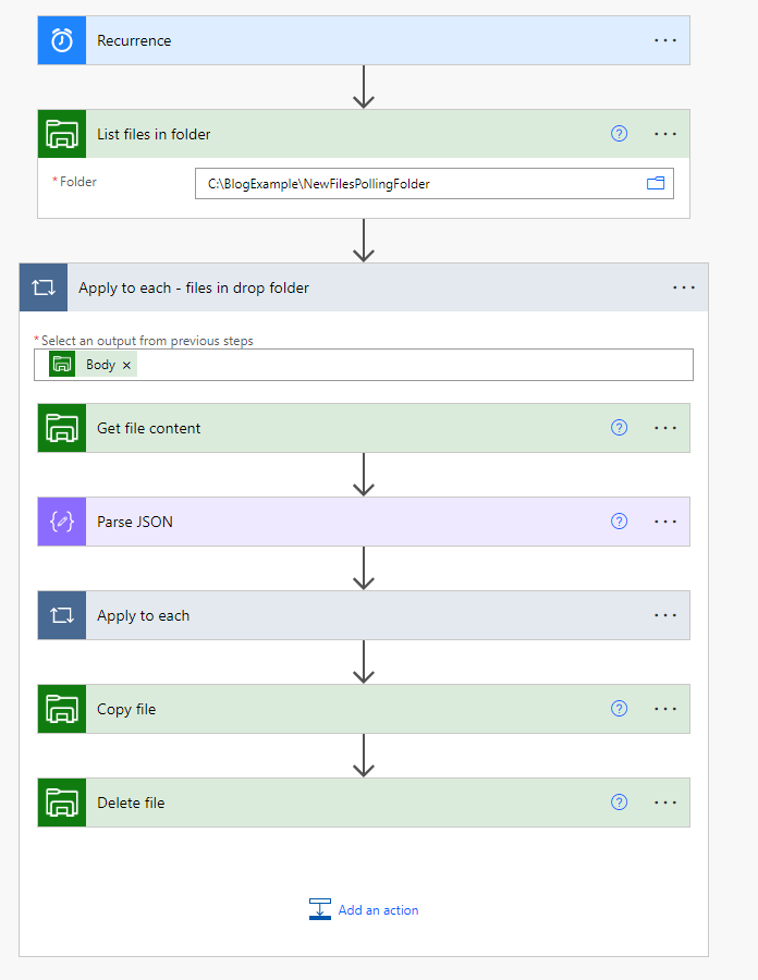 Useimmiten järkevämpää on säännöllisesti käsitellä kaikki kansioon ilmestyneet tiedostot. Se onnistuu List files in folder -toimintoa hyödyntäen.