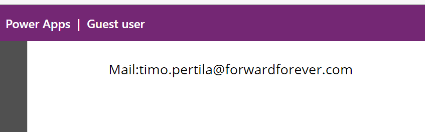Joskus User().Mail -komennon palauttama sähköposti on eri kuin Dataverse-käyttäjän ensisijainen sähköposti. Tällöin käyttäjää ei löydy ja kaikki menee pieleen.