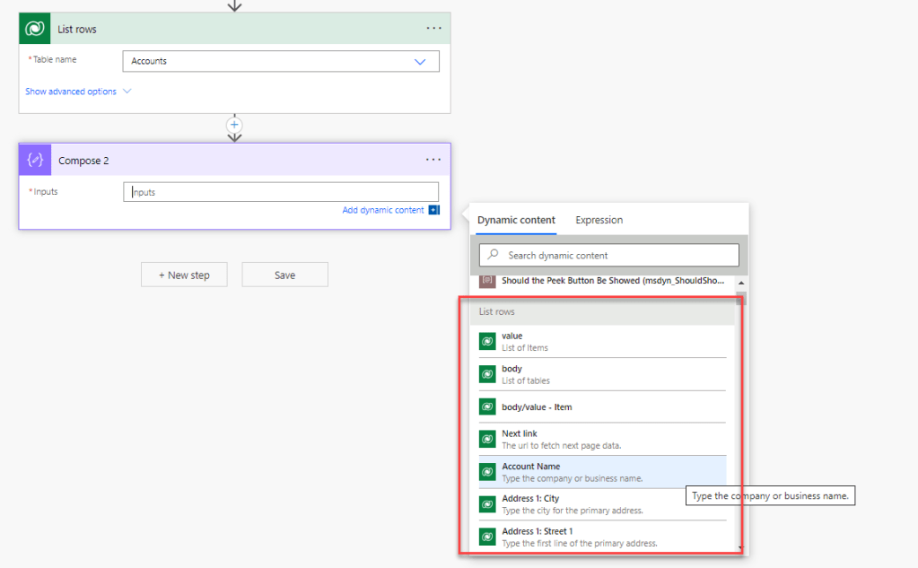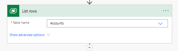 Power Platformissa ratkaisuja rakennetaan yhdistimien (connector) avulla. Haetaan esimerkiksi flown List rows -toiminnolla kaikki asiakkaat (Accounts).