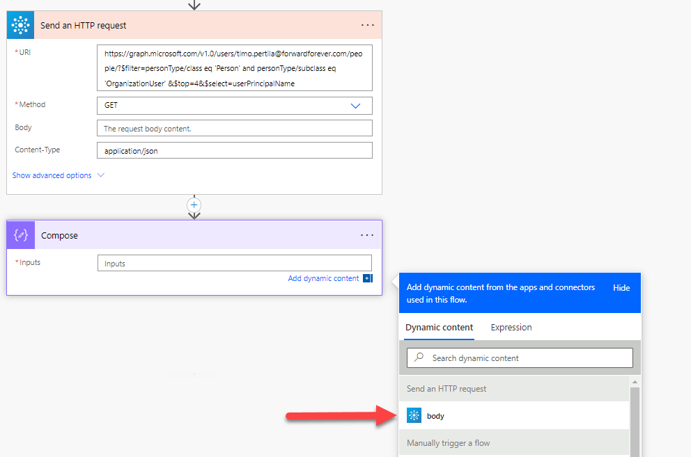 Useimmiten voimme unohtaa tämän JSON:in kokonaan, sillä asiakkaan tietoja (nimi, osoite jne) voi käyttää flow’ssa suoraan.