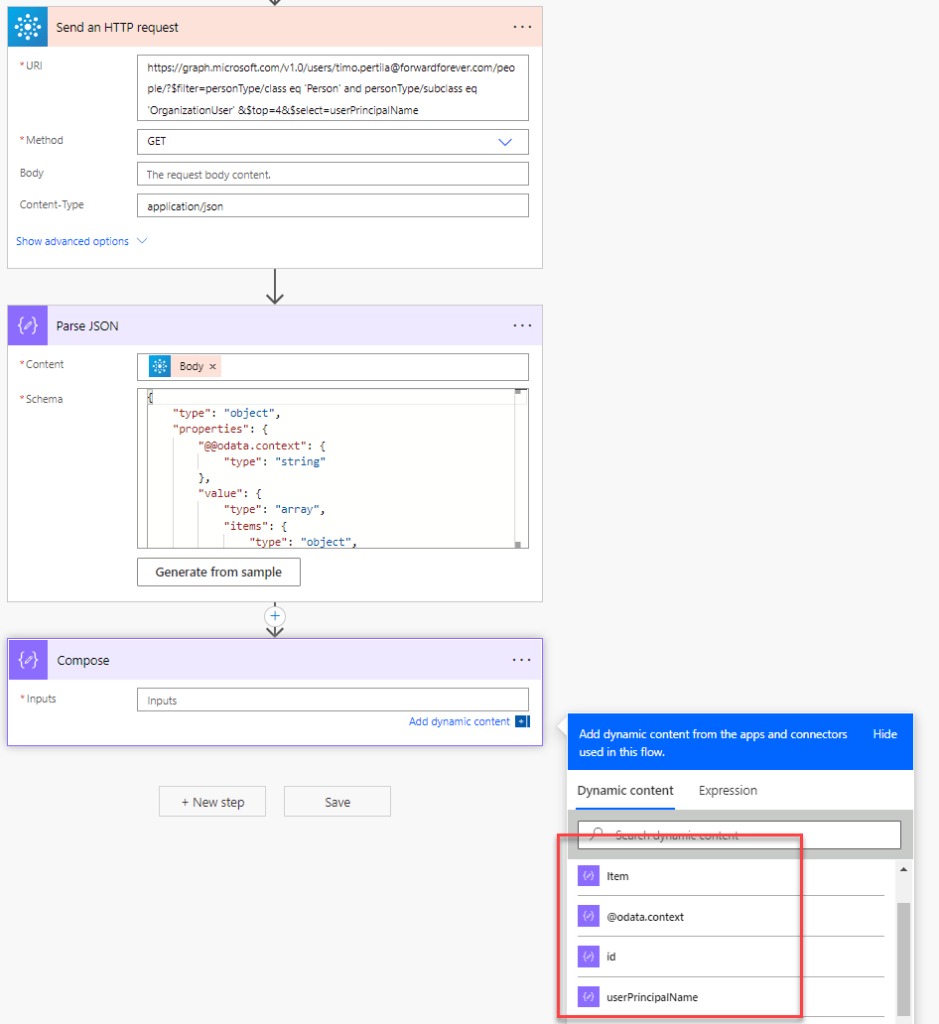 Mikäli haluamme käyttää paluuarvoja tuttuun tapaan, tulee meidän parsia JSON:in sisältö itse. Tämä tehdään Parse JSON -toiminnolla, jossa kuvataan JSON:in rakenne (Schema) tietotyyppeineen.