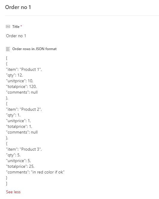 Hahmotellaan yksinkertaista tilaussovellusta. Yksi tilaus voi sisältää useita tuotteita. Koko tilaus tuotteineen tallennetaan yhdelle SharePoint -listan riville. Listan yksi sarake (Order rows in JSON format) sisältää tilatut tuotteet JSON-muodossa.