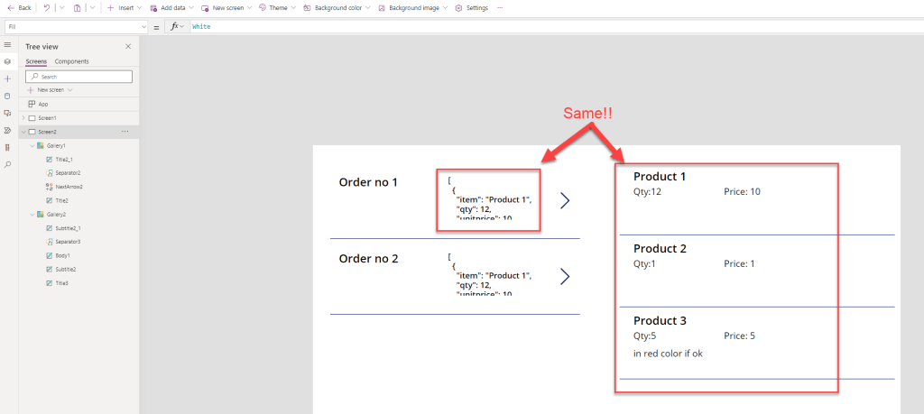 Esitetään tilausrivit Power Appsin galleriassa. Tilauksen sisältämät tuotteet ovat rivillä JSON-muodossa, mutta Power Appsin näkökulmasta sisältö on vain tekstiä. Emme esimerkiksi voi esittää tilauksen sisältöä omassa galleriassaan.
