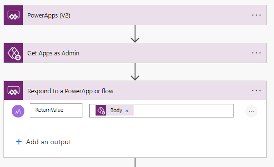 Alla Power Appsista käynnistyvä flow, joka hakee ympäristön sovellukset ja palauttaa ne tietoineen kutsuvalle Power Appsille. Koska paluusanoma sisältää JSON:in lisäksi myös sen rakenteen kuvauksen (schema), voi tulosjoukkoa hyödyntää sellaisenaan esimerkiksi gallerian arvona.