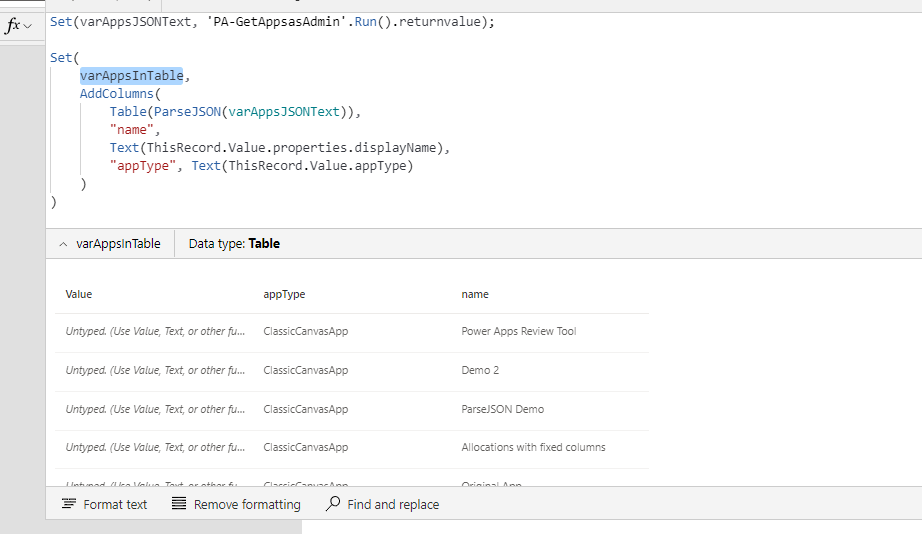 - Luodaan varAppsJSONText-muuttujasta ParseJSON ja AddColumns -toimintojen arvolla taulukko, joka sisältää Power Appsin nimen (Name) ja tyypin (AppType)