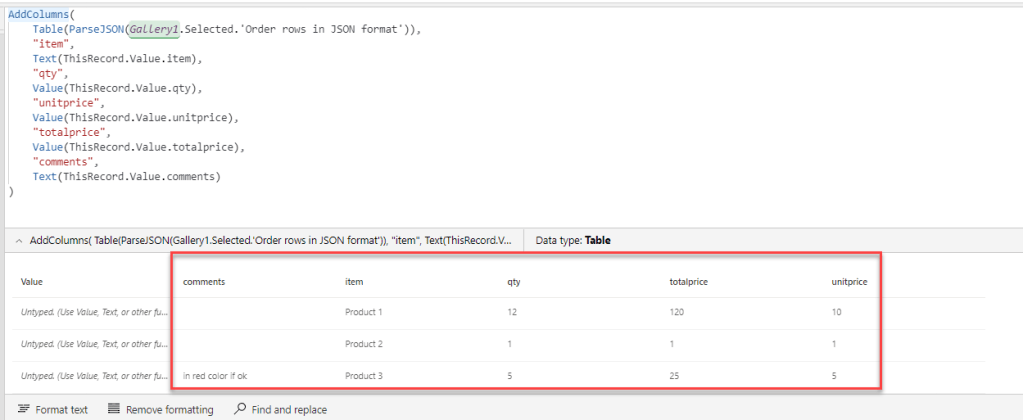 Table(ParseJSON(Gallery1.Selected.'Order rows in JSON format')),