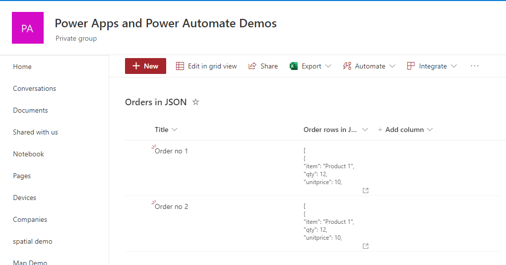 Hahmotellaan yksinkertaista tilaussovellusta. Yksi tilaus voi sisältää useita tuotteita. Koko tilaus tuotteineen tallennetaan yhdelle SharePoint -listan riville. Listan yksi sarake (Order rows in JSON format) sisältää tilatut tuotteet JSON-muodossa.