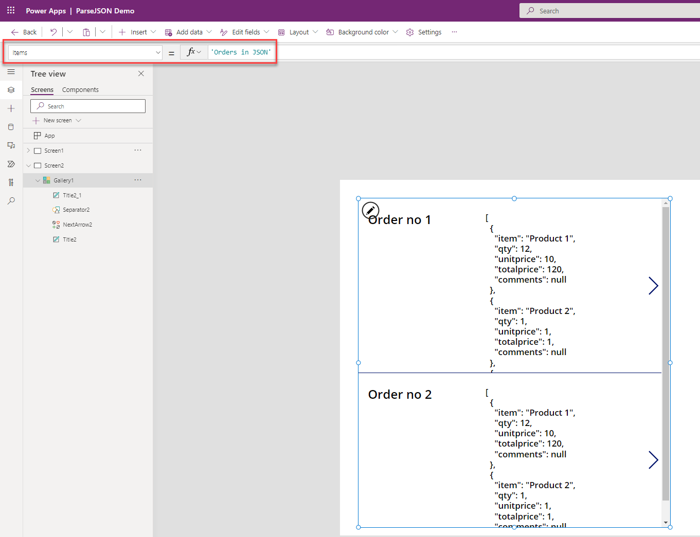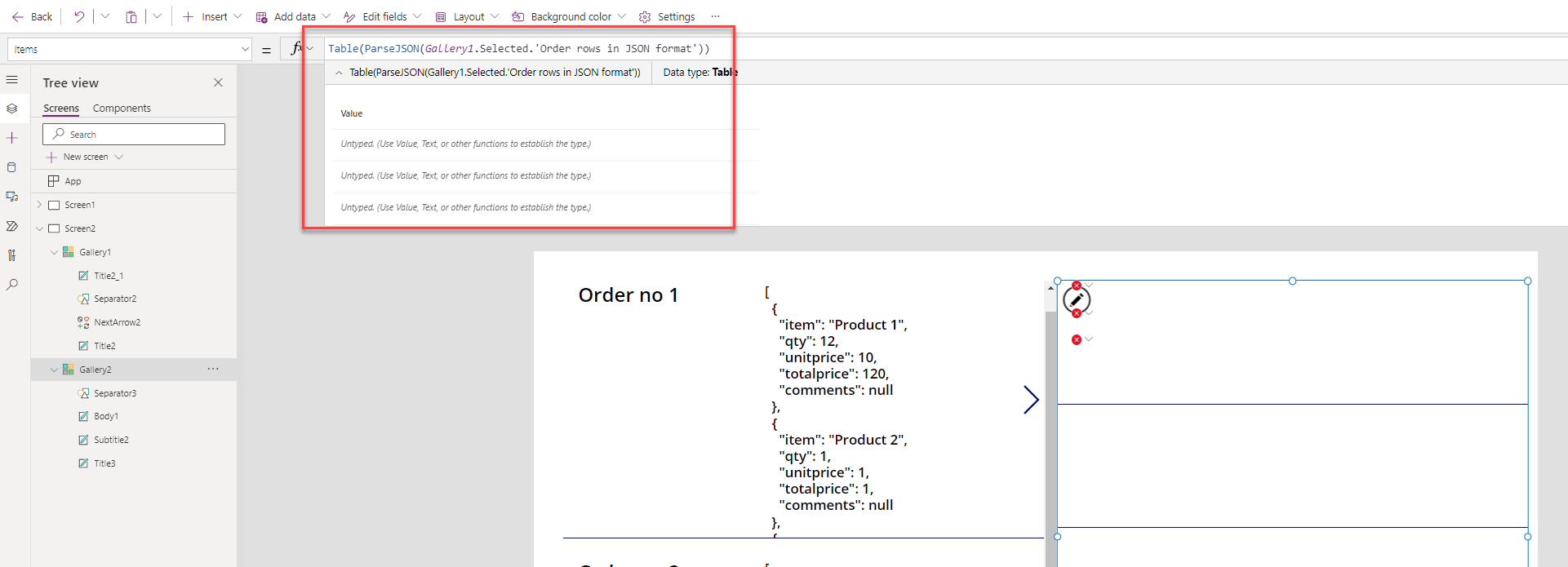Esitetään tilausrivit Power Appsin galleriassa. Tilauksen sisältämät tuotteet ovat rivillä JSON-muodossa, mutta Power Appsin näkökulmasta sisältö on vain tekstiä. Emme esimerkiksi voi esittää tilauksen sisältöä omassa galleriassaan.