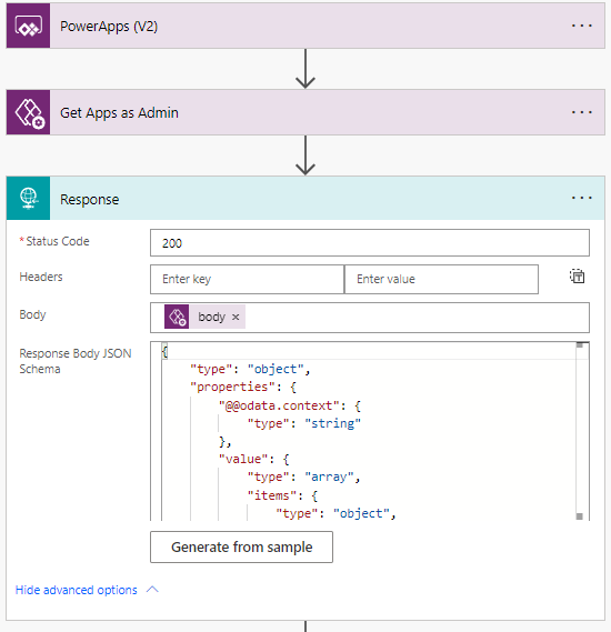Alla Power Appsista käynnistyvä flow, joka hakee ympäristön sovellukset ja palauttaa ne tietoineen kutsuvalle Power Appsille. Koska paluusanoma sisältää JSON:in lisäksi myös sen rakenteen kuvauksen (schema), voi tulosjoukkoa hyödyntää sellaisenaan esimerkiksi gallerian arvona.