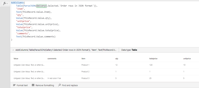 Table(ParseJSON(Gallery1.Selected.'Order rows in JSON format')),