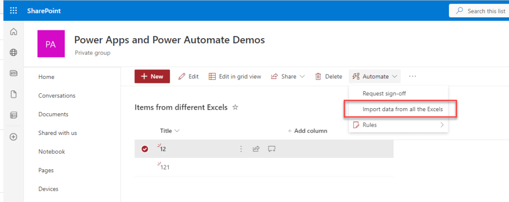 Tehdään lopulta Power Appsilla käynnistettävä flow, joka suorittaa tietojen siirron Exceleistä SharePoint-listalle.